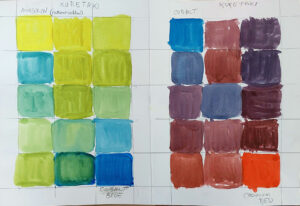 Thank you for sharing your color charts. Between those swatches and the swinging of the season back towards summer when I engaged so happily in making swatches in response to garden glory, I find myself wanting to play with watercolor and color mixing again. I’m admiring the range of color you generated. Looks like you may have used some leftover paint to bring color to an artgraf line-and-smudge sketch that is giving my eye some exercise as it explores happily.